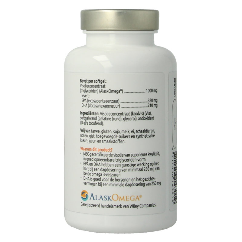 | Visolieconcentraat (triglyceriden)(AlaskOmega®) levert: – EPA (eicosapentaeenzuur) – DHA (docasahexaeenzuur) |